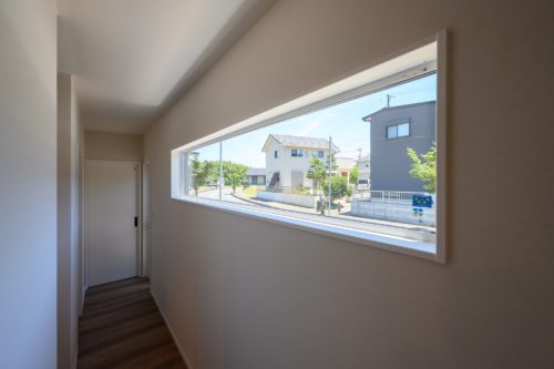 キッチン・ダイニングとリビングを程よく区分けすることで、それぞれの空間の自由度を高めたLDK。窓のレイアウトも工夫して、真南からの日差しを取りこんで明るい空間を実現する一方、リビングの道路側には窓を設けず、道路からの視線が気にならないつくりとしました。
