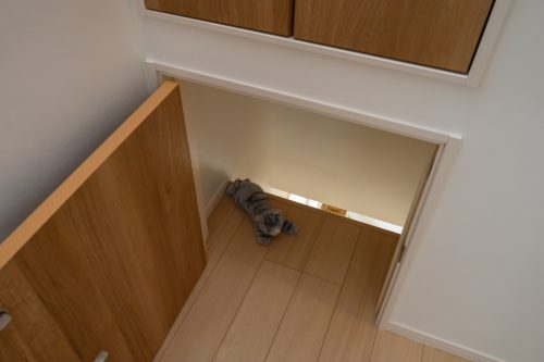 2階の主寝室は部屋の隅に小さな扉があります。扉の先につながるのが1階の猫部屋。猫部屋と寝室を行ったり来たり、気ままな猫との楽しい生活が想像できますね。