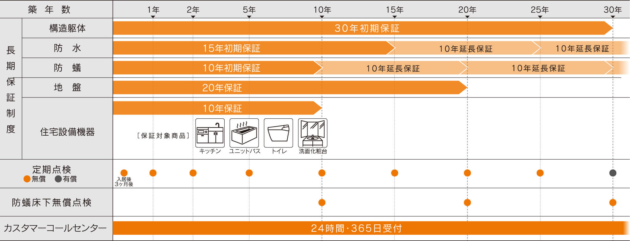 ご入居後も安心の生涯サポートシステム“しっかり建てて、しっかり検査して、しっかりアフターフォローする”が合言葉です。地域密着型のきめ細かなフットワークで、ご入居後はカスタマーズセンターの専門スタッフが25年間に8回の定期点検を行っています。また、長期保証期間終了後もご相談・ご要望にお応えできるようにお客様の暮らしをサポートいたします。 ※長期優良住宅を取得した場合は30年目まで5年ごとに無償点検をいたします。