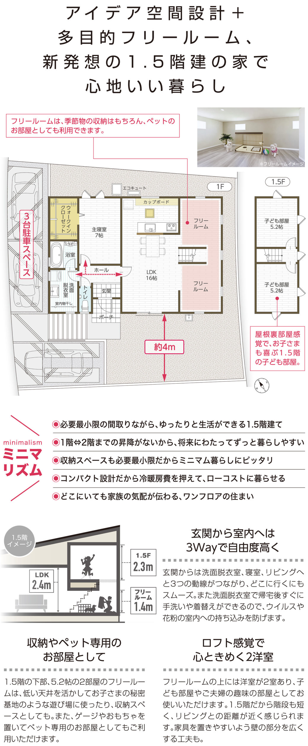 平屋のように暮らせるアイデア空間+新発想1.5階建ての住まい