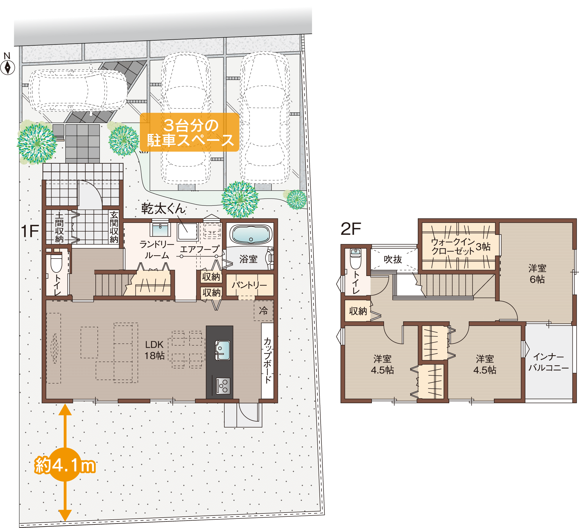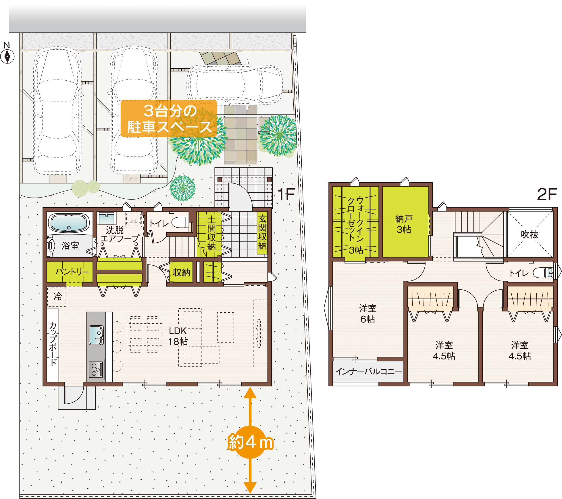 ウォークインクローゼットと納戸をそれぞれ3帖の広さで配置した集中収納。