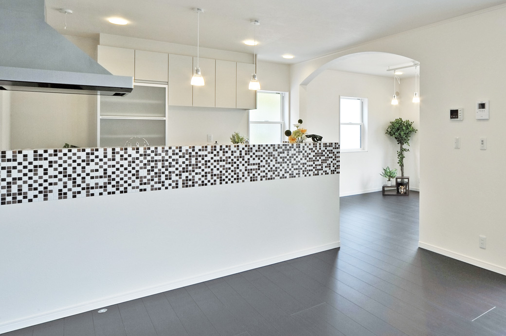 アイアン素材のフラワーボックスなどヨーロピアンテイストの家シンプルなシルエットの外観ながら、アイアン素材のフラワーボックスなどをあしらったモダンなヨーロピアンテイストの住まい。ホワイトとダークカラーの組合せが印象的な室内インテリア。 アイアン素材の階段手すりやモノトーンのモザイクタイルなど、 落ち着きのある空間デザインとなっています。