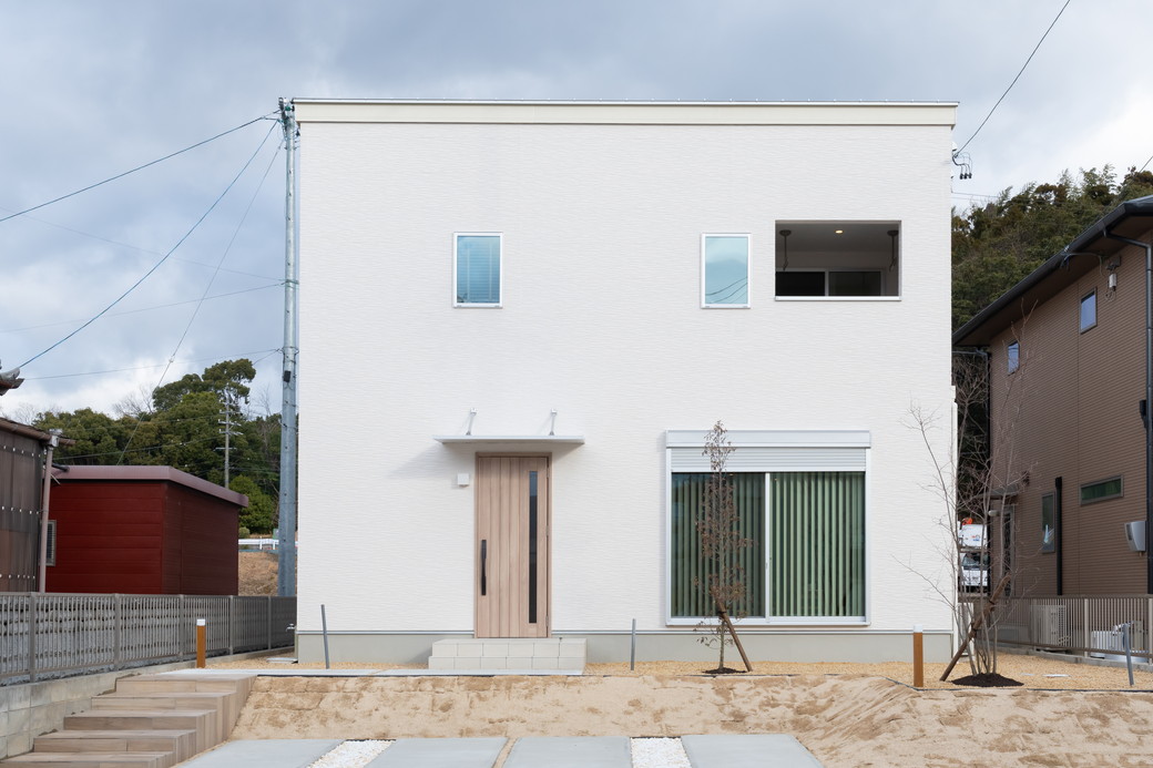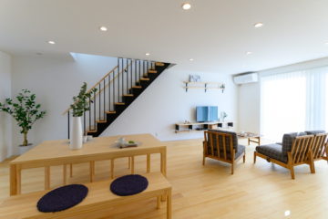 無垢床材をつかった住まい無垢床材は触れるたびに温かみを感じるLDK。玄関入ってすぐキッチンまでの動線は非常に便利。玄関横にはクローゼットを配置しています。南と北に掃き出し窓を設置しましたので光と風の通り道となっています。