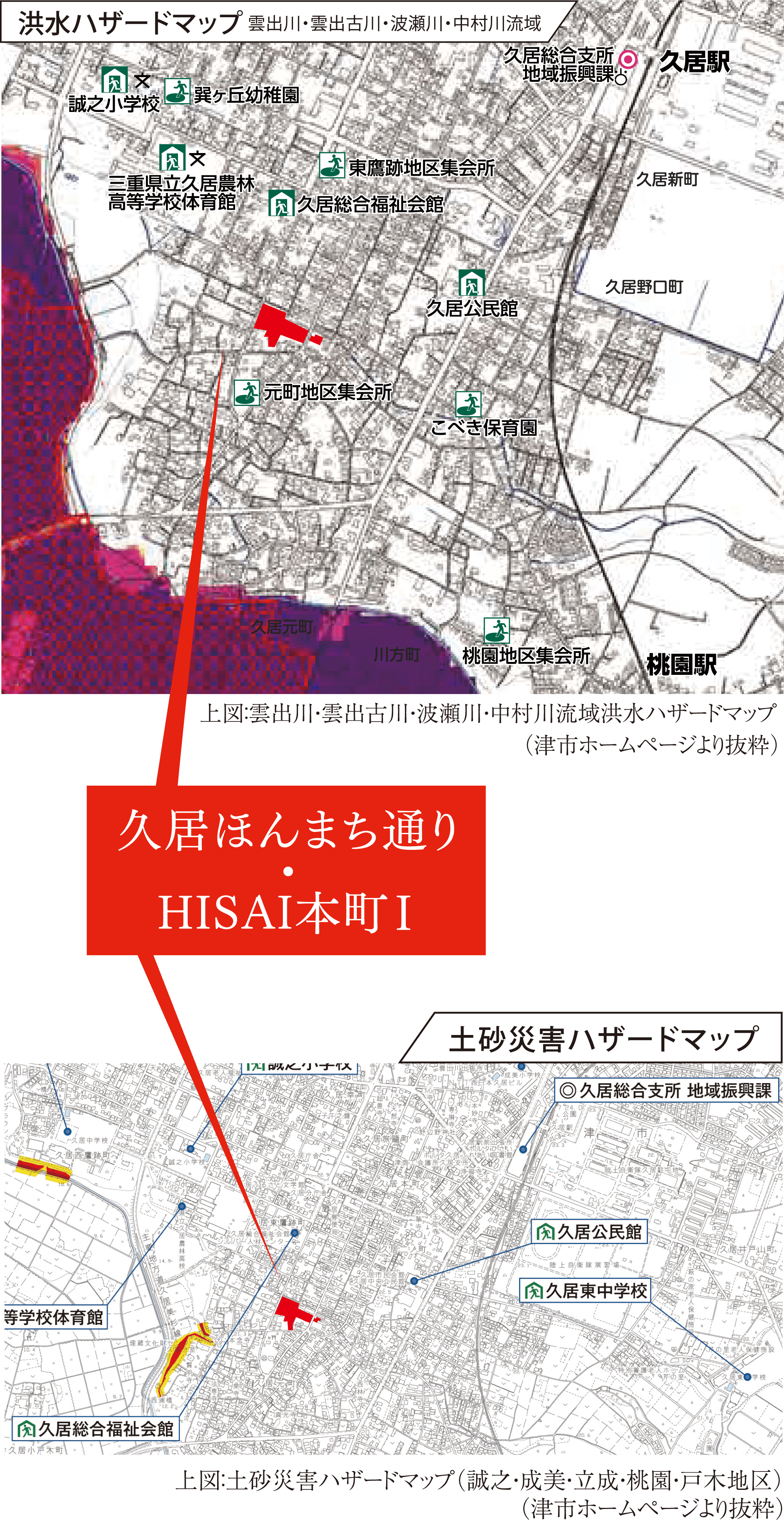 「久居ほんまち通り」&「HISAI本町Ⅰ」があるエリアは海抜22.4mで、万が一、
